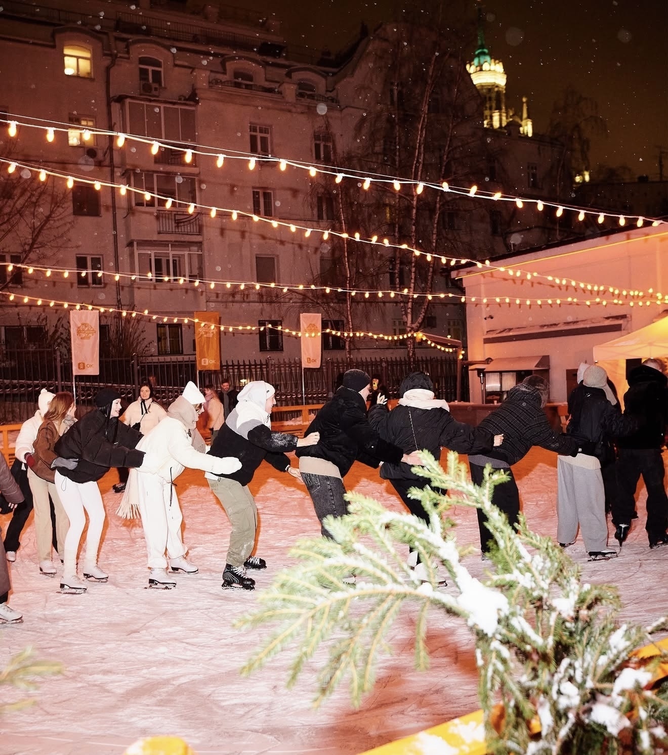 Во дворе ресторана на Яузской спрятался очень камерный и уютный каток с кинопоказами, DJ-сетами и вечеринками на льду, цветной подсветкой, ламповой атмосферой и видом на Высотку на Котельнической набережной. Ужин после катания никто не отменял. Подкрепиться можно корейскими корн-догами и вафлями с нутеллой, а согреться – чаем с брусникой, можжевельником и тимьяном из спешл-меню.