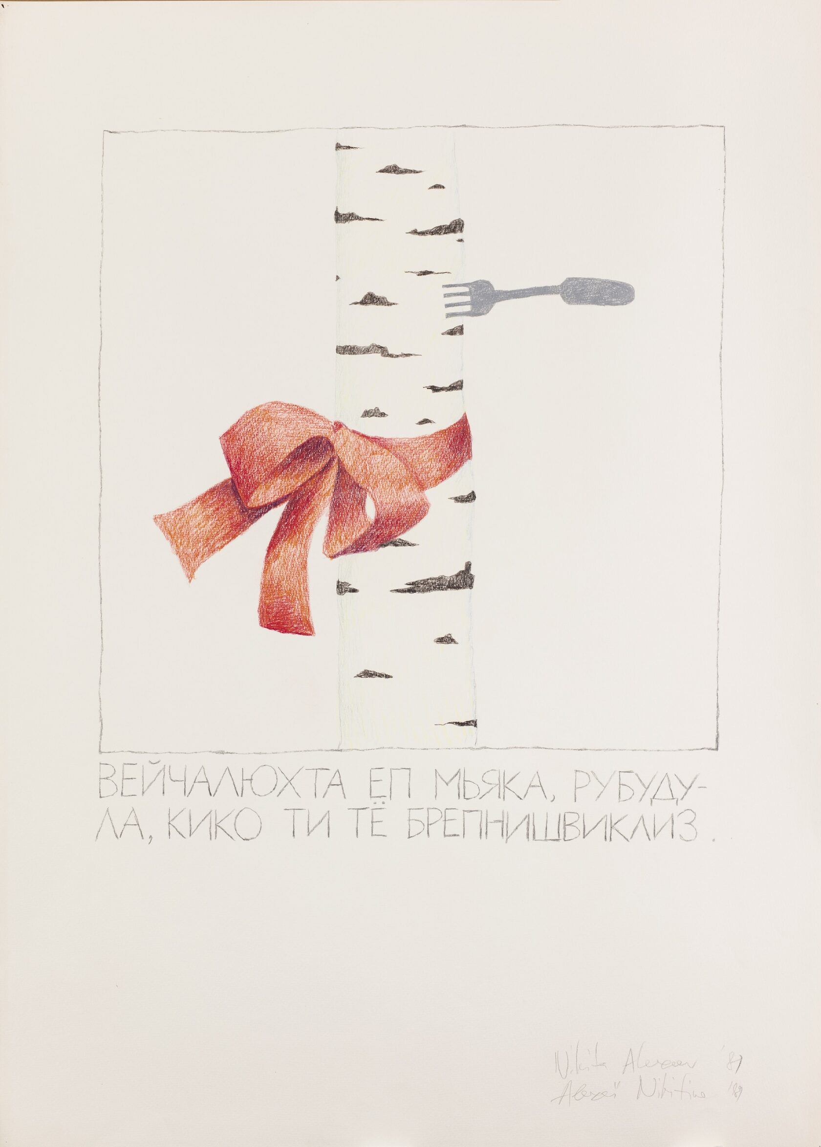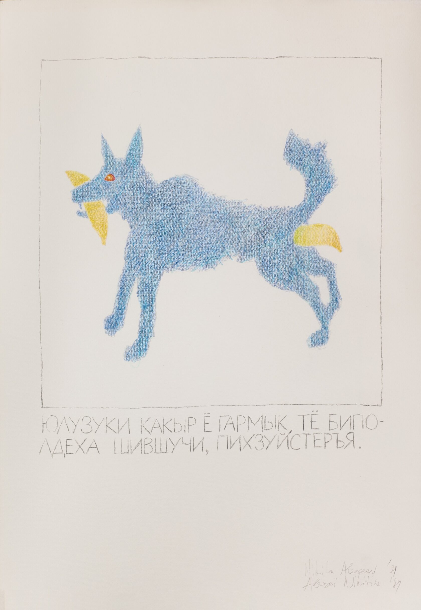 Слово — неотъемлемая часть графических иллюстраций, выполненных цветными карандашами. На одних работах — фразы на английском и французском «в лоб», на других — видимо, одному Алексееву понятные наборы звуков, напоминающие экзотические языки, которые автор уловил на слух и передал кириллицей. Такое «заигрывание» с языками он действительно практиковал. Готовя серию работ «Ближе — дальше — ближе» к выставкам в Японии, художник попросил прислать, как название пишется по-японски, причем как можно крупнее и проще. Вспоминал, как тренировался два часа, чтобы перерисовать, несмотря на четыре года обучения шрифтам в МХУ памяти 1905 года.