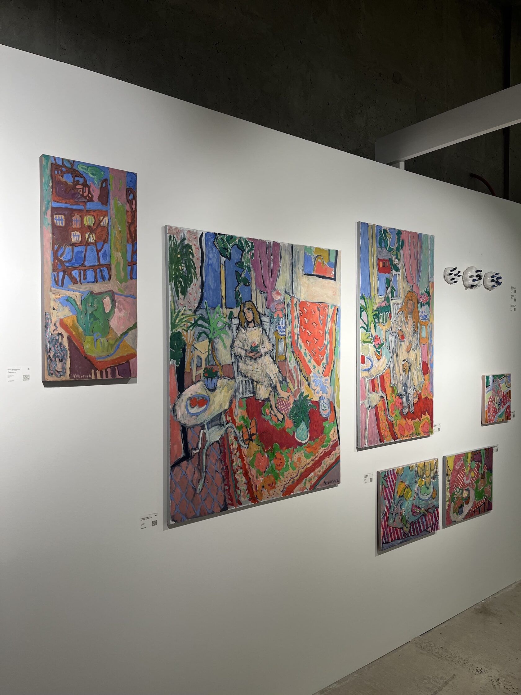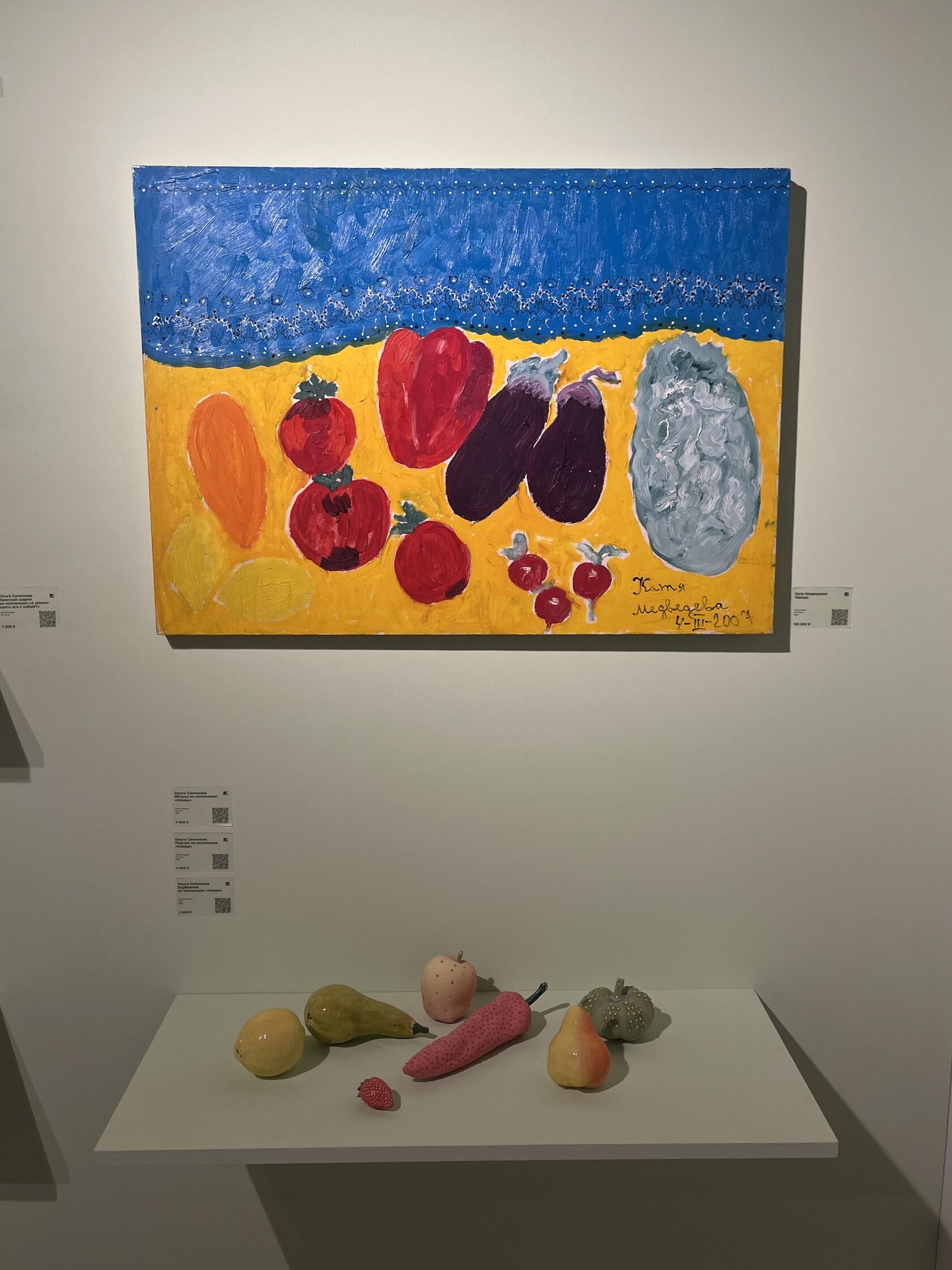 Напротив — работы художницы-самоучки Кати Медведевой, чей талант был признан Марком Шагалом. Гостей встречает сочный натюрморт с овощами, который удачно дополнили «огородные» арт-объекты из керамики молодой петербургской художницы Ольги Симоновой. Среди ее работ — затейливые гибкие конструкции, элементы которых можно менять местами с помощью магнитов, становясь соавтором произведений.
