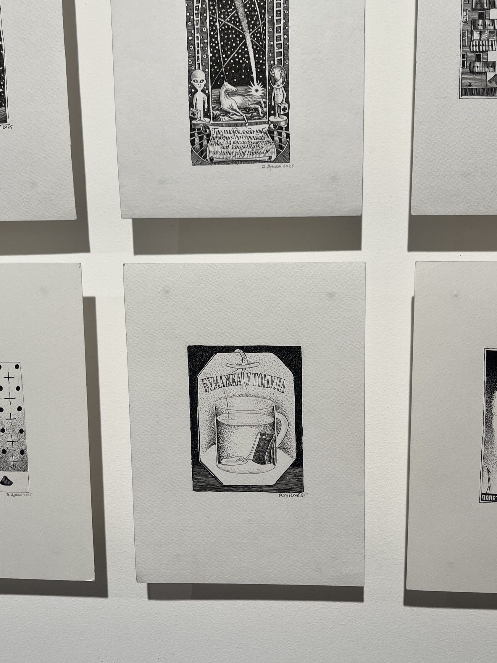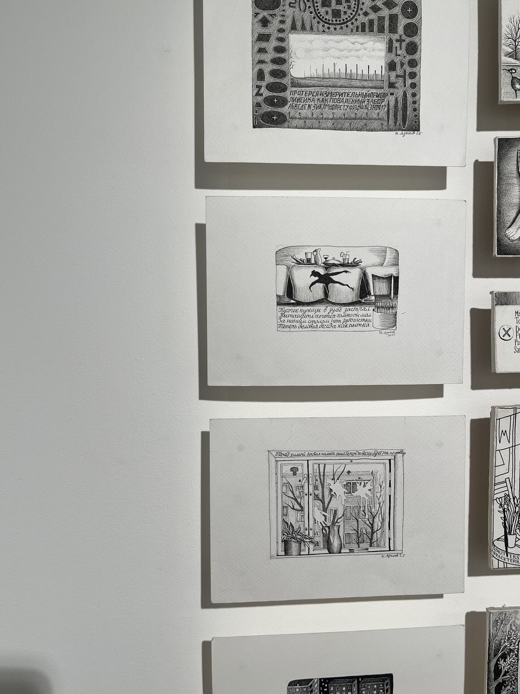 На стенде InGallery посетителей возле своих работ встречал художник-график Иван Языков. На серию «Микродрамы» рекомендуем заложить время и разглядеть все: изначально она была задумана как цикл из 365 миниатюр, но на ярмарке их кратно меньше. Сюжеты вдохновлены мимолетными будничными впечатлениями, которые и веселят, и расстраивают. Среди «Микродрам» — кусочек курицы, предательски застрявший между зубами, упавший в кружку ярлык чайного пакетика и последний «вздох» зажигалки».