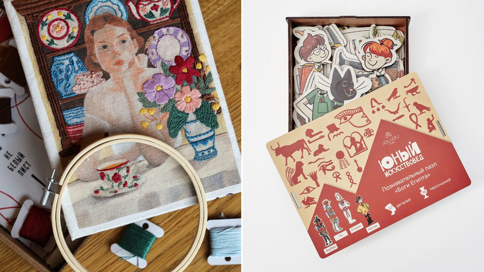 Набор для вышивания в рамках коллаборации ресторана Rebecca и бренда «Не белый лист», 2 200 руб; Пазл «Боги Египта» «Юный искусствовед», 1 400 руб