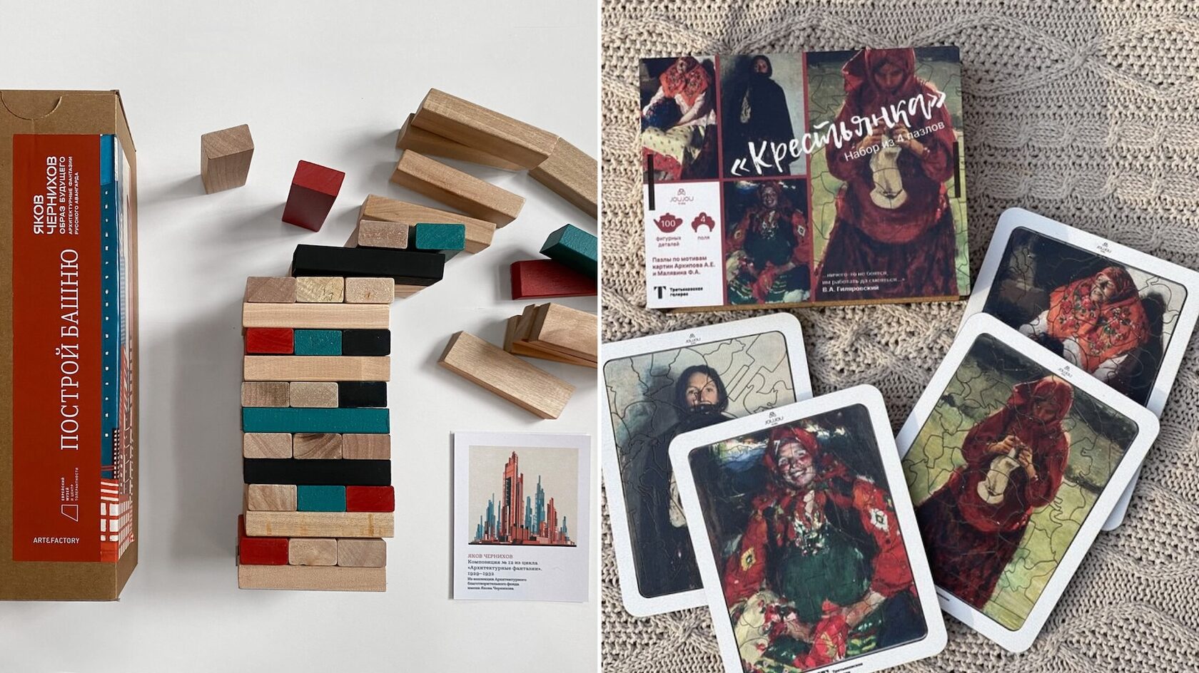 Игра «Построй башню» для выставки «Яков Чернихов. Образ будущего. Архитектурные фантазии русского авангарда» в ЕМЦТ, 1 700 руб; Набор из пазлов «Крестьянка» Jou Jou kids (Третьяковская галерея), 1 700 руб