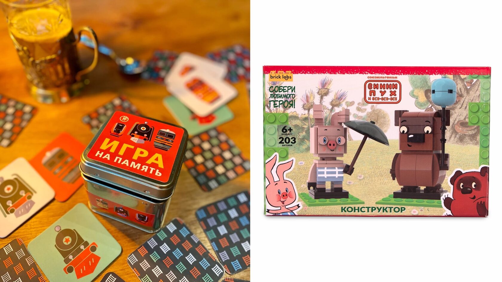 Игра на память (Музей железных дорог России), 860 руб; Конструктор «Винни-пух и Пятачок» Brick Labs, 1 499 руб
