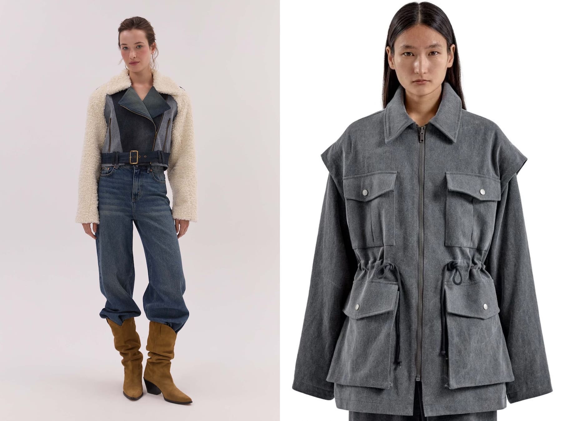 Куртка-косуха из денима и экомеха Only Me x Rishi, 29 980 руб; Куртка-сафари Unique Fabric, 49 900 руб
