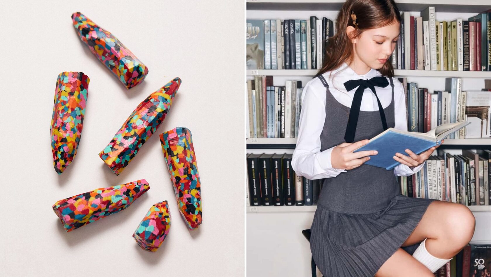 Восковой карандаш Novem Kids, 690 руб; Жилет и юбка Ostin, 1 599 руб и 2 599 руб