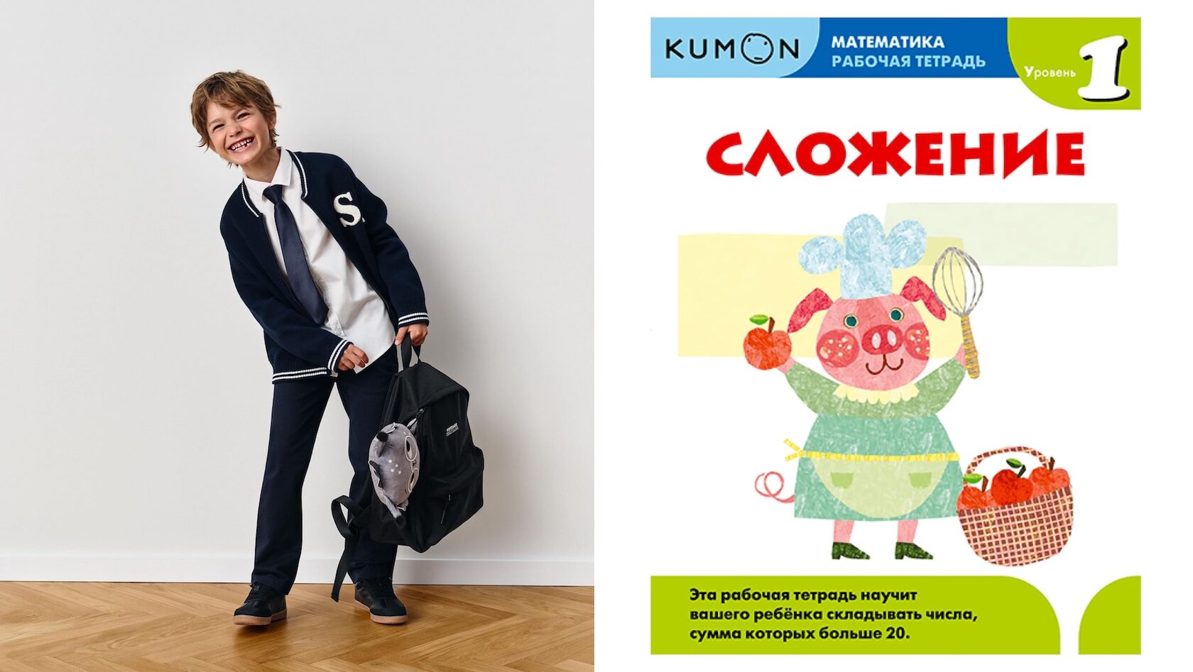 Бомбер и брюки Sela, 2 999 руб и 1 999 руб; Тетрадь МИФ Kumon, 550 руб