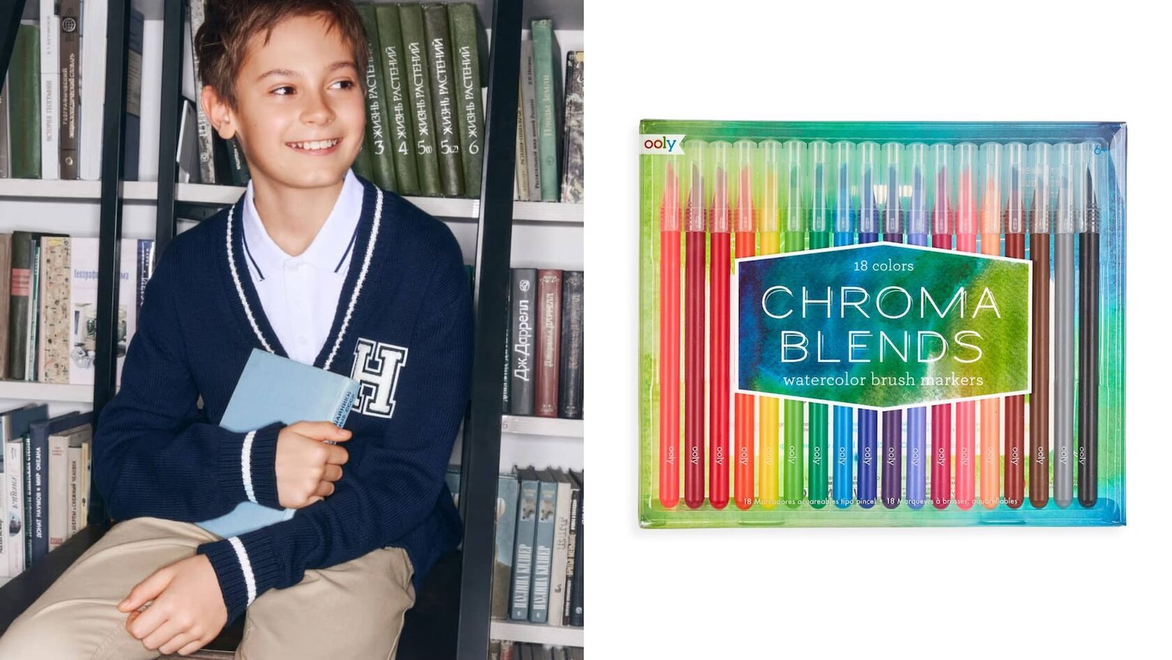 Кардиган и брюки Ostin, 2 999 руб и 1 999 руб; Набор цветных акварельных фломастеров OOLY (Bunny Hill), 3 490 руб