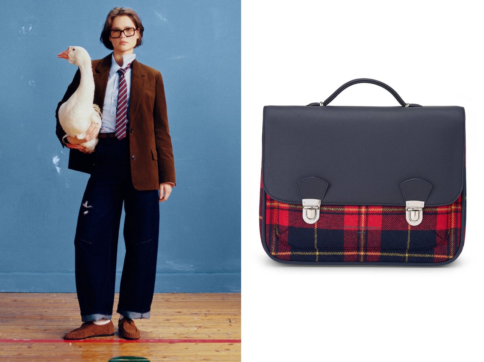 Пиджак и джинсы Befree, 5 299 руб и 3 599 руб; Портфель Age of Innocence, 26 780 руб