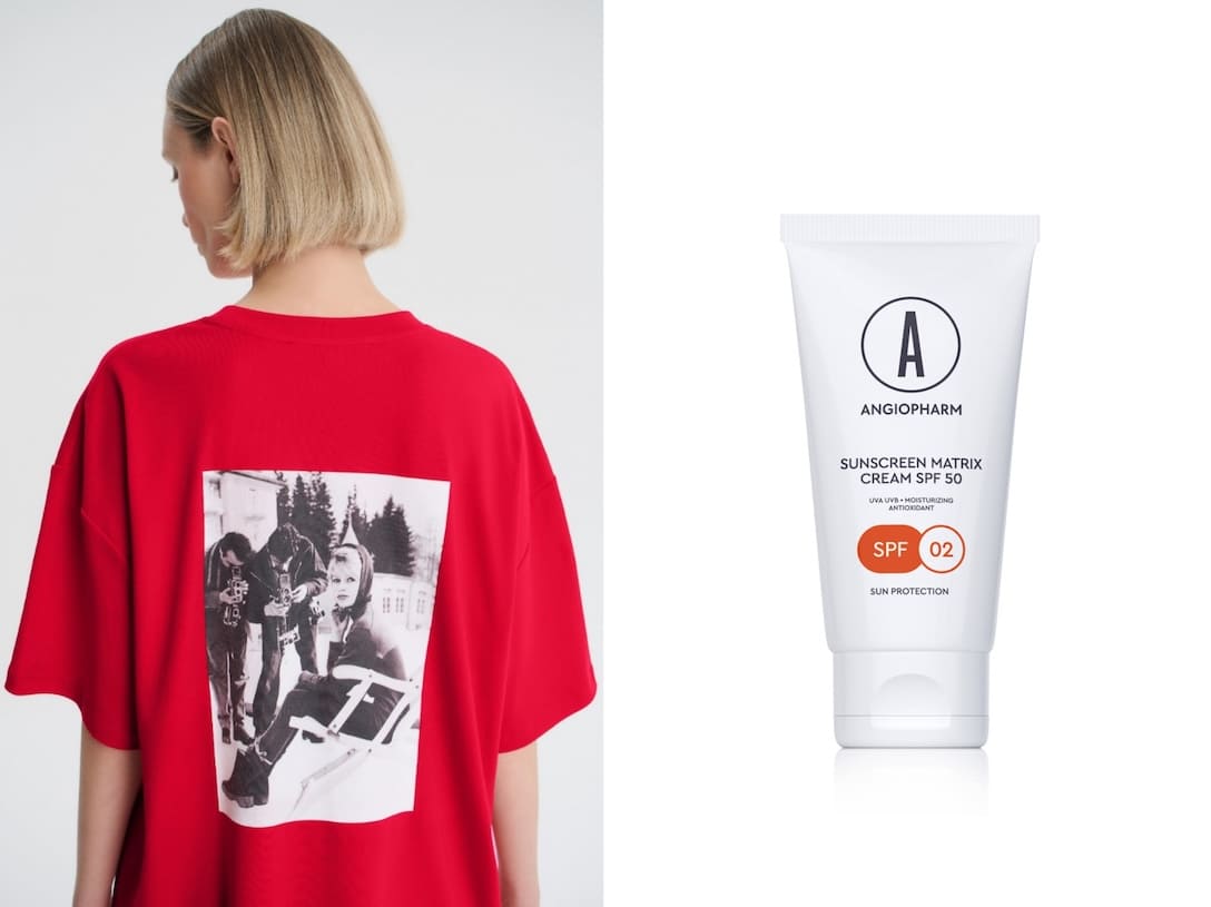 Футболка Lamoda x FASHION REBELS, 7 900 руб; Солнцезащитный крем SPF50 Angiopharm, 2 880 руб