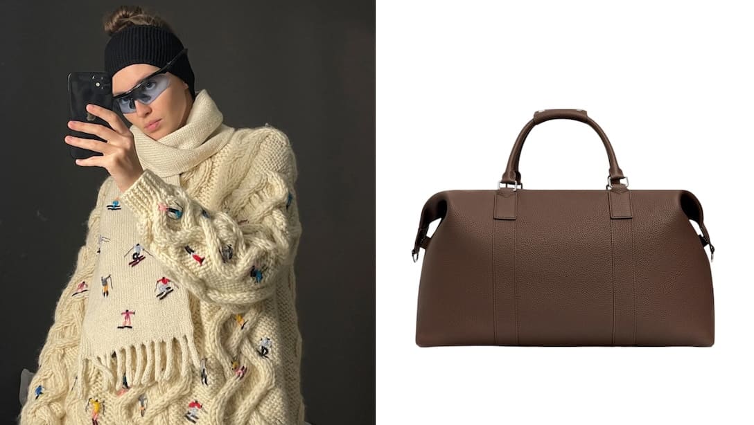 Свитер и шарф Mirstores, 45 990 руб и 19 990 руб; Дорожная сумка 12storeez, 79 000 руб