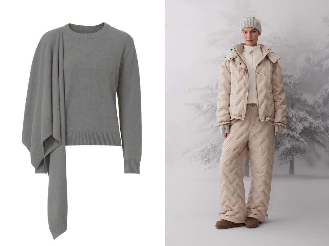 Кашемировый свитер с палантином Lyna Plus, 89 100 руб; Пуховик и брюки belle you, 29 999 руб и 19 999 руб