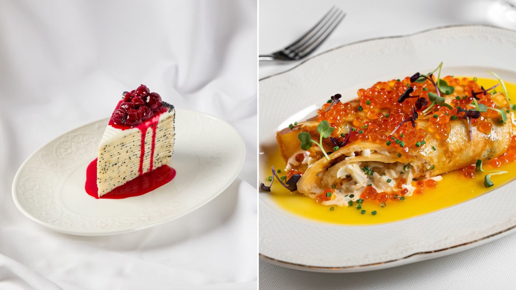 Маковый блинный торт Dr.Живаго, 550 руб; Блины с крабом и красной икрой Sirena, 1 850 руб