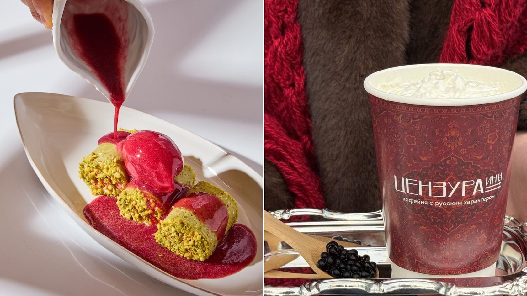 Блинный каннеллони с йогуртовым муссом, фисташкой и малиновым сорбетом Peshi, 750 руб; Блин в стакане «Цензура ИН1:1», 450 руб