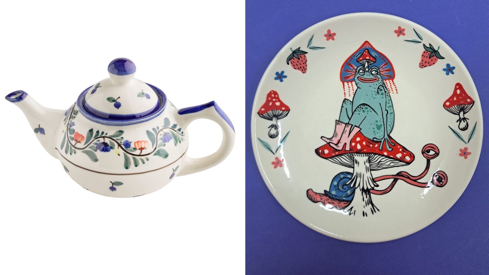 Чайник «Дымов Керамика» 6 240 руб; Тарелка «Жабка на мухоморе» My Thing, 3 500 руб