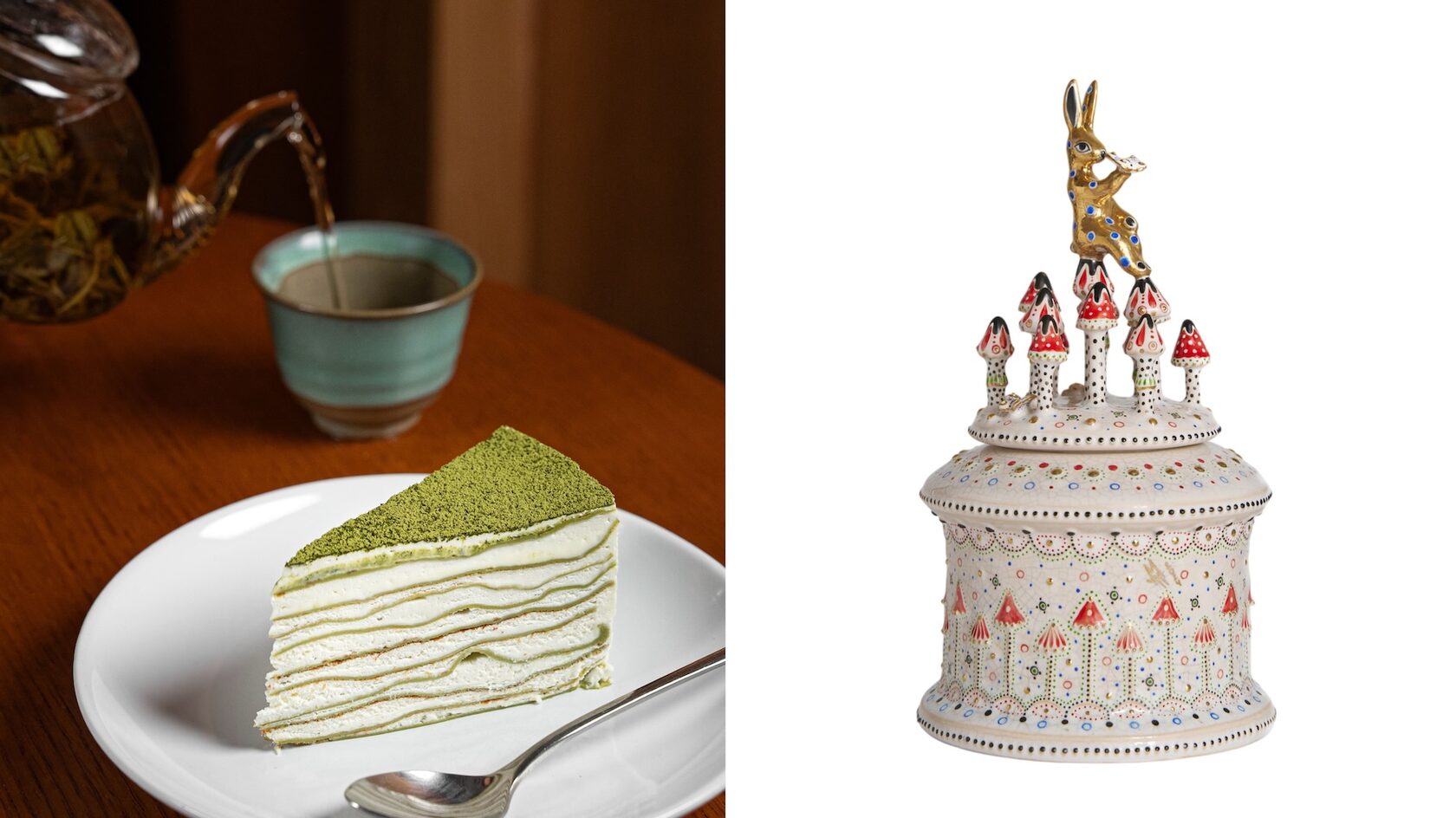 Блинный торт с матча и маскарпоне Novikov Moscow, 690 руб; «Шкатулка с Самодовольным Золотым Кролем» Makarov Ceramics, цена по запросу
