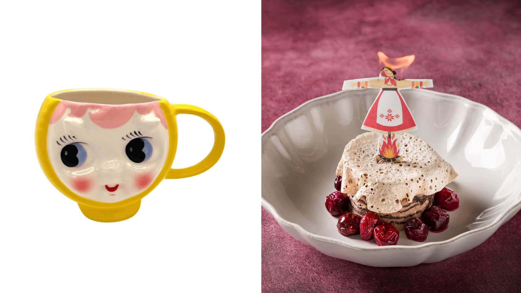 Кружка «Поведай», 6 900 руб; Блинный торт Levantine, 750 руб