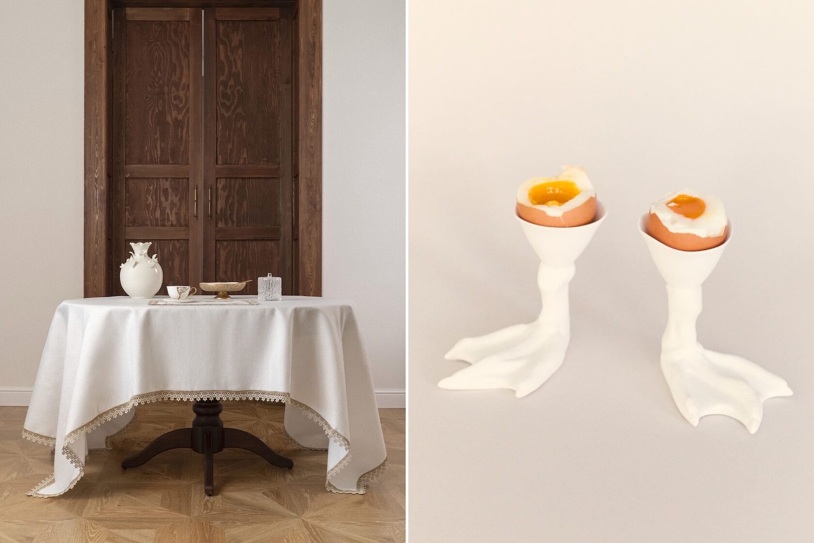 Скатерть Kuchenland, 4 990 руб; Подставка для яиц из костяного фарфора Serax (Yadoma), 10 070 руб