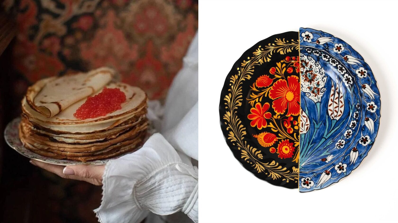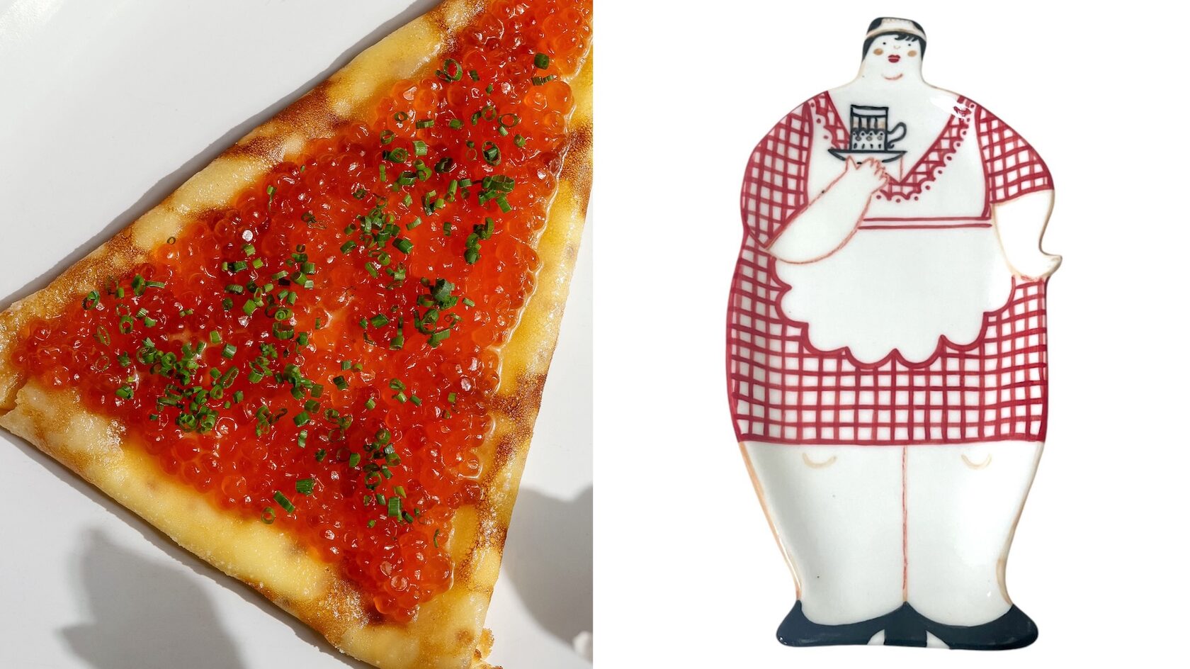 Блин с икрой Finch, 550 руб; Тарелка «Буфетчица» (Dari Dari), 3 700 руб