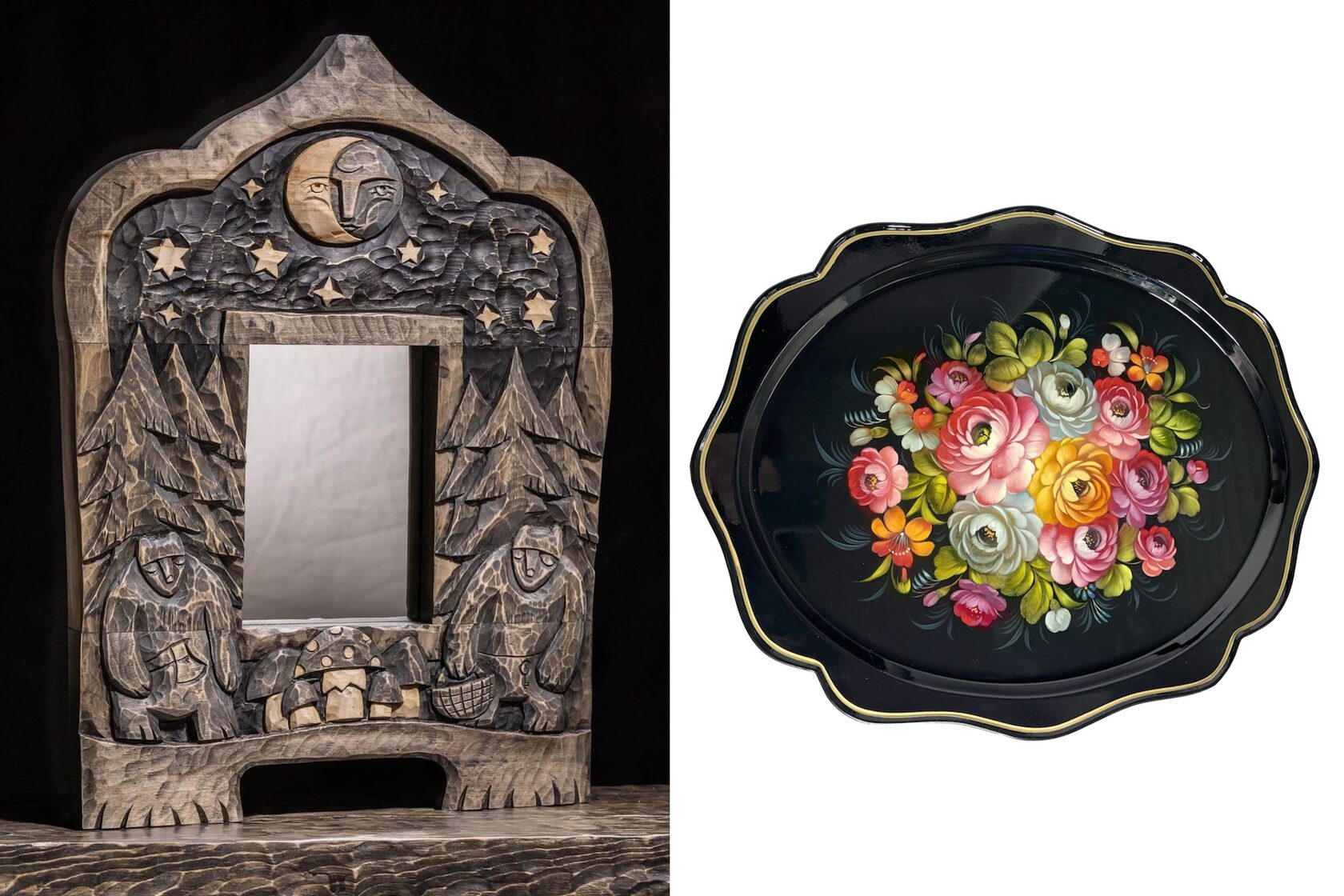 Резное зеркало Александр Ивасенко, цена по запросу; Поднос The Dar Store × «Жостово», 23 540 руб