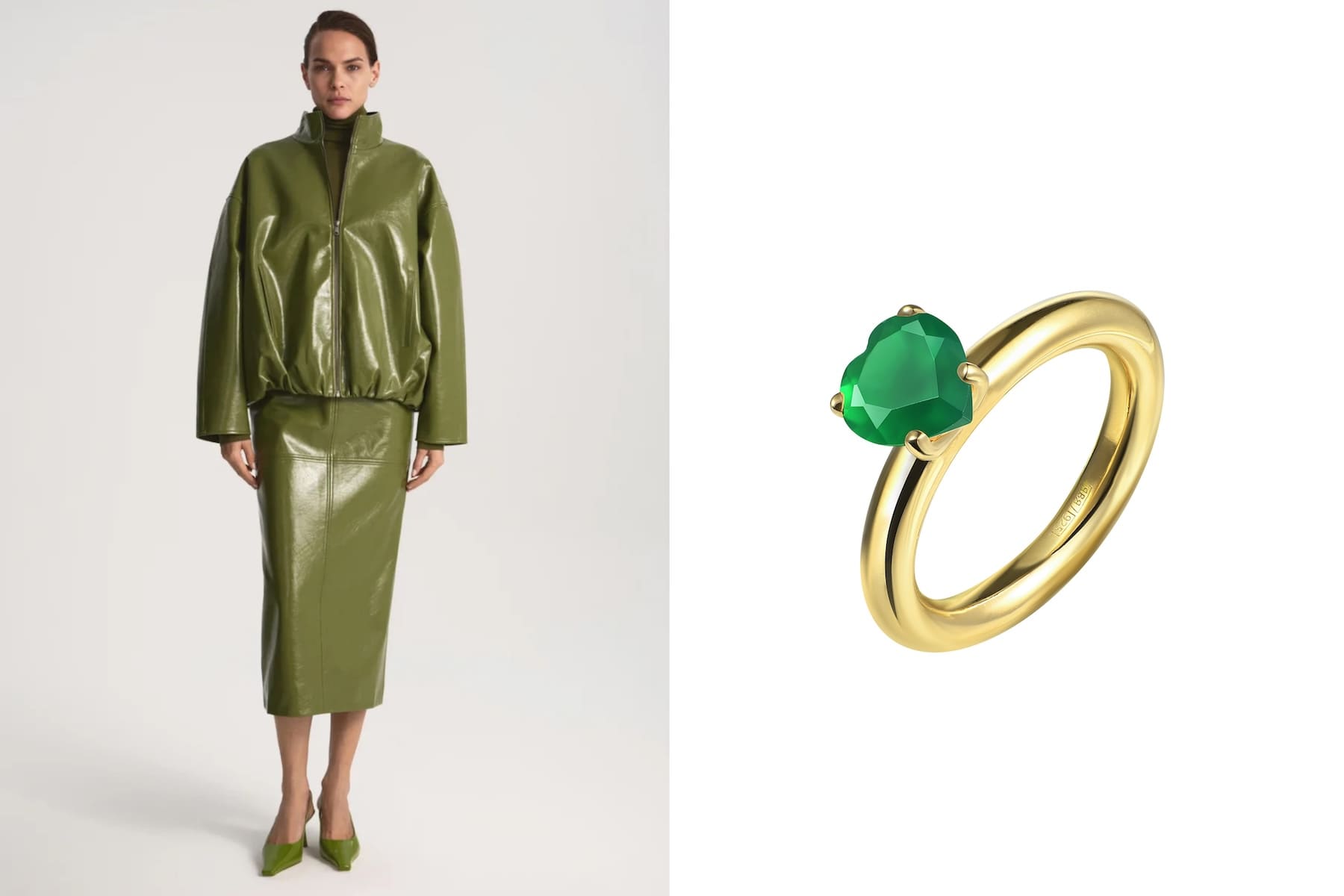 Бомбер и юбка 1811stores, 22 990 руб и 13 990 руб; Кольцо c изумрудным агатом Moonka, 8 640 руб