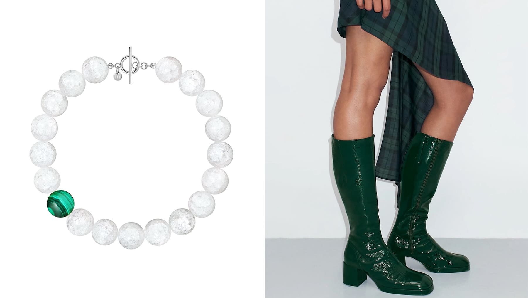 Бусы с сахарным кварцем и малахитом Moonka, 17 900 руб; Сапоги Miista (Nuself), 54 400 руб