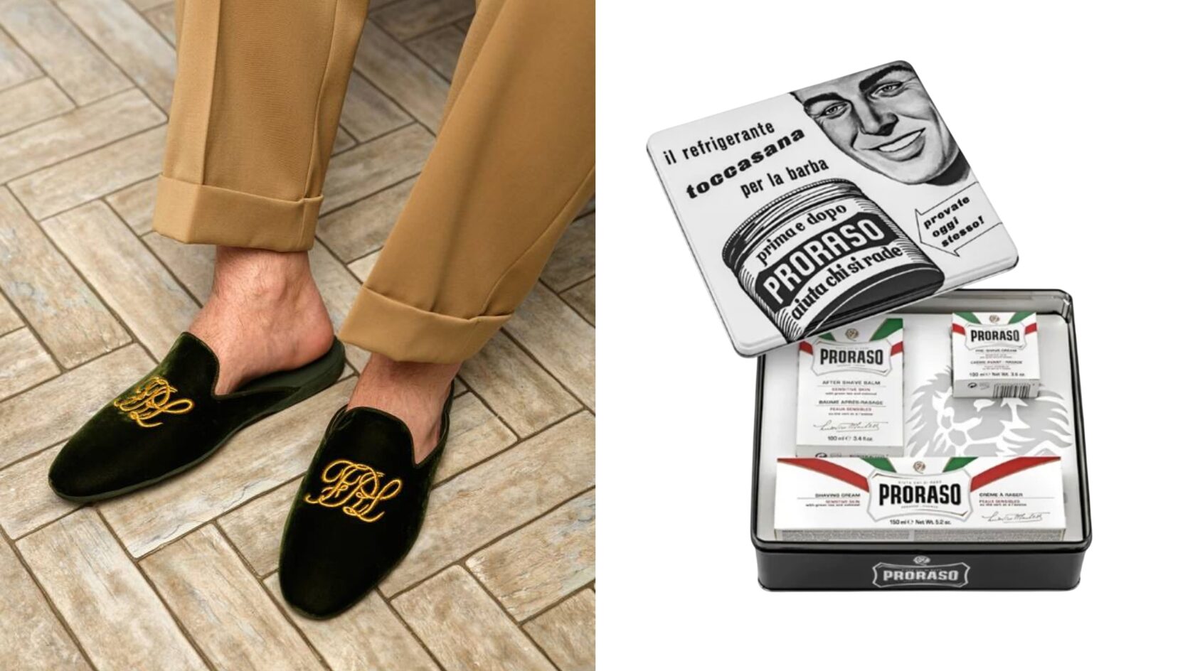 Домашние тапки Farfalla (Checkroom), 22 500 руб; Набор для бритья Proraso, 2 964 руб