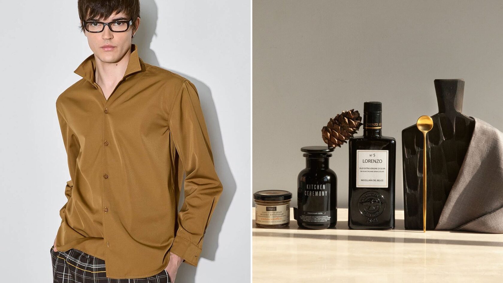 Рубашка Rogov, 8 000 руб; Подарочный набор Kitchen Ceremony (сванская соль, оливковое масло, соус, полотенце из льна, доска из массива дуба, шишка сибирского кедра), 14 550 руб