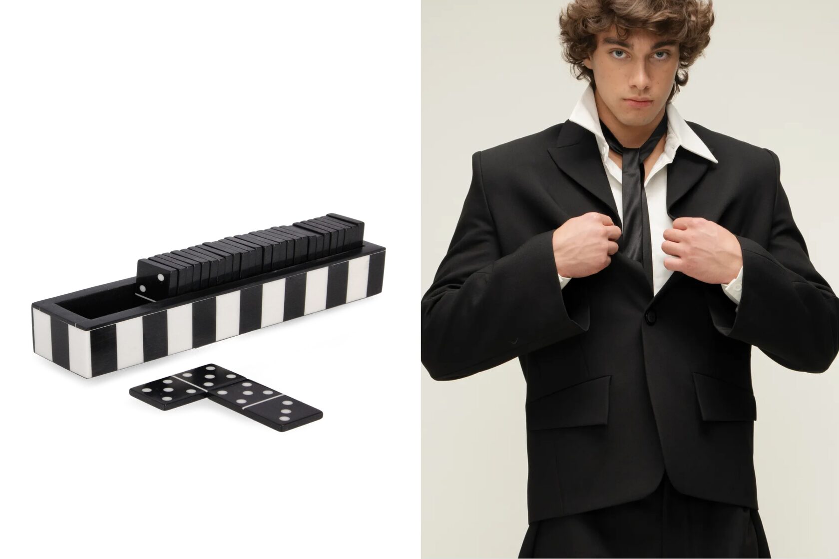 Домино «Новогоднее ателье» (Yadoma), 11 100 руб; Пиджак ChernimCherno, 33 300 руб