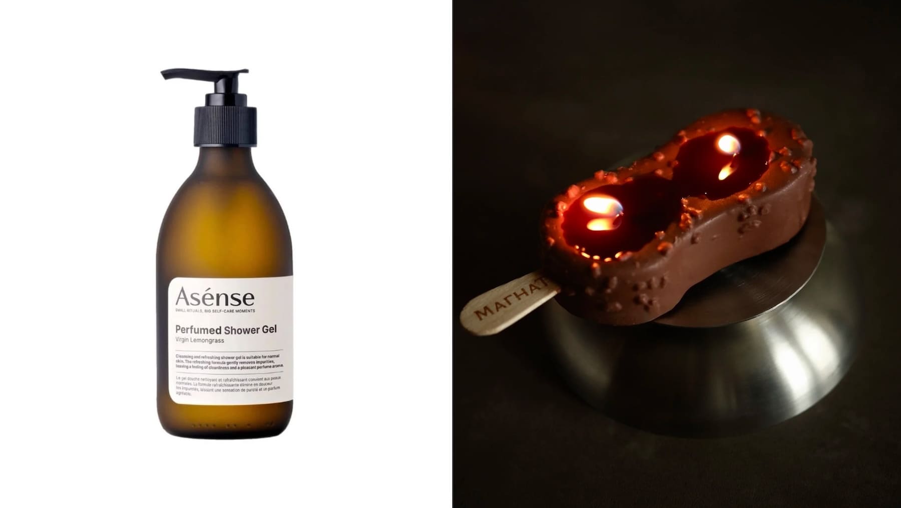 Гель для душа Asense, 1 350 руб; Свеча-мороженое Магнат GOLD x nōtem, 2 900 руб