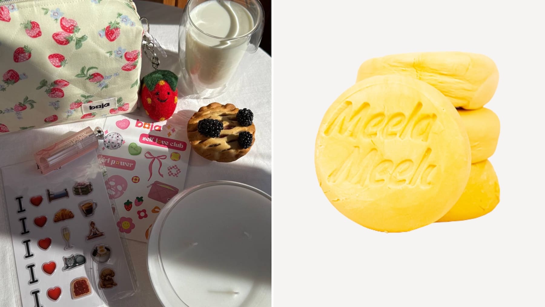 Клубничный сет HI&BYE и BOJA, 4 200 руб; Твердый шампунь Meela Meelo, 450 руб