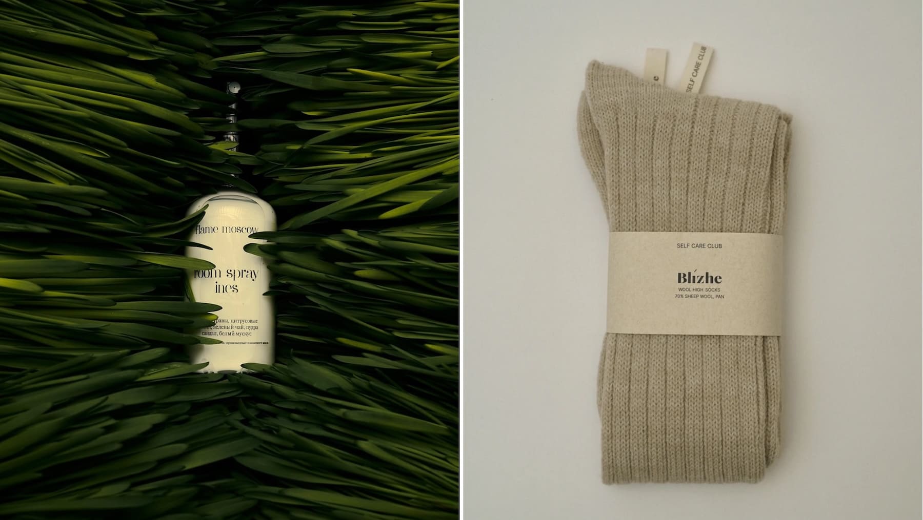 Душистая вода-спрей для дома Flame Moscow, 1 500 руб; Шерстяные гольфы Blizhe, 1 900 руб