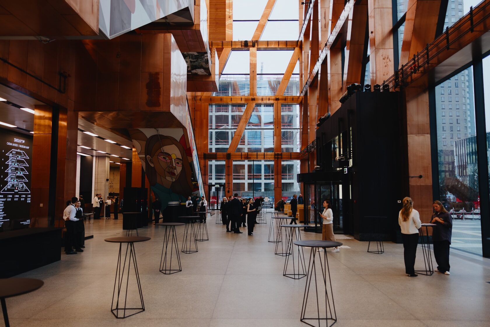 Первое впечатление — гигантский атриум, который ощущается скорее как внутренняя площадь города: ты все еще «на улице», но улица вдруг заполняется теплым медным светом. В архитектуре есть понятие «второй свет», когда второй этаж сделан не на полную площадь помещения, оставляя высокие потолки пространству первого этажа. Здесь же получился пятый свет, так как атриум протянулся вверх на все пять этажей, до самого (еще одна аллегория) «пятого неба». В атриуме встречают зиловский лимузин, холодильник с замочком — привет коммунальному прошлому, а еще — технологичный гардероб, где ваши пальто ждет автоматизированная карусель, которую отлично видно со стойки — музей тоже начинается с вешалки.