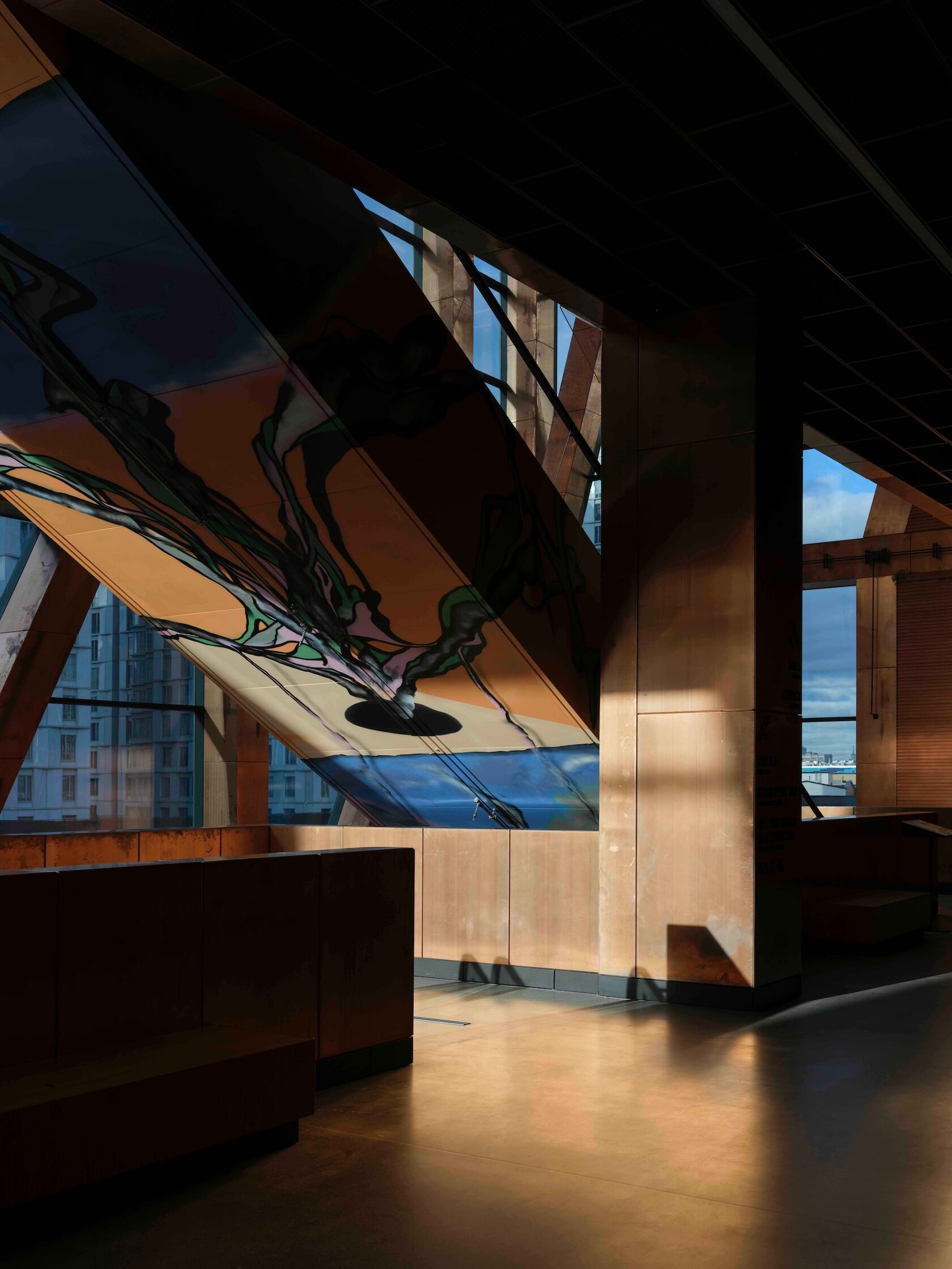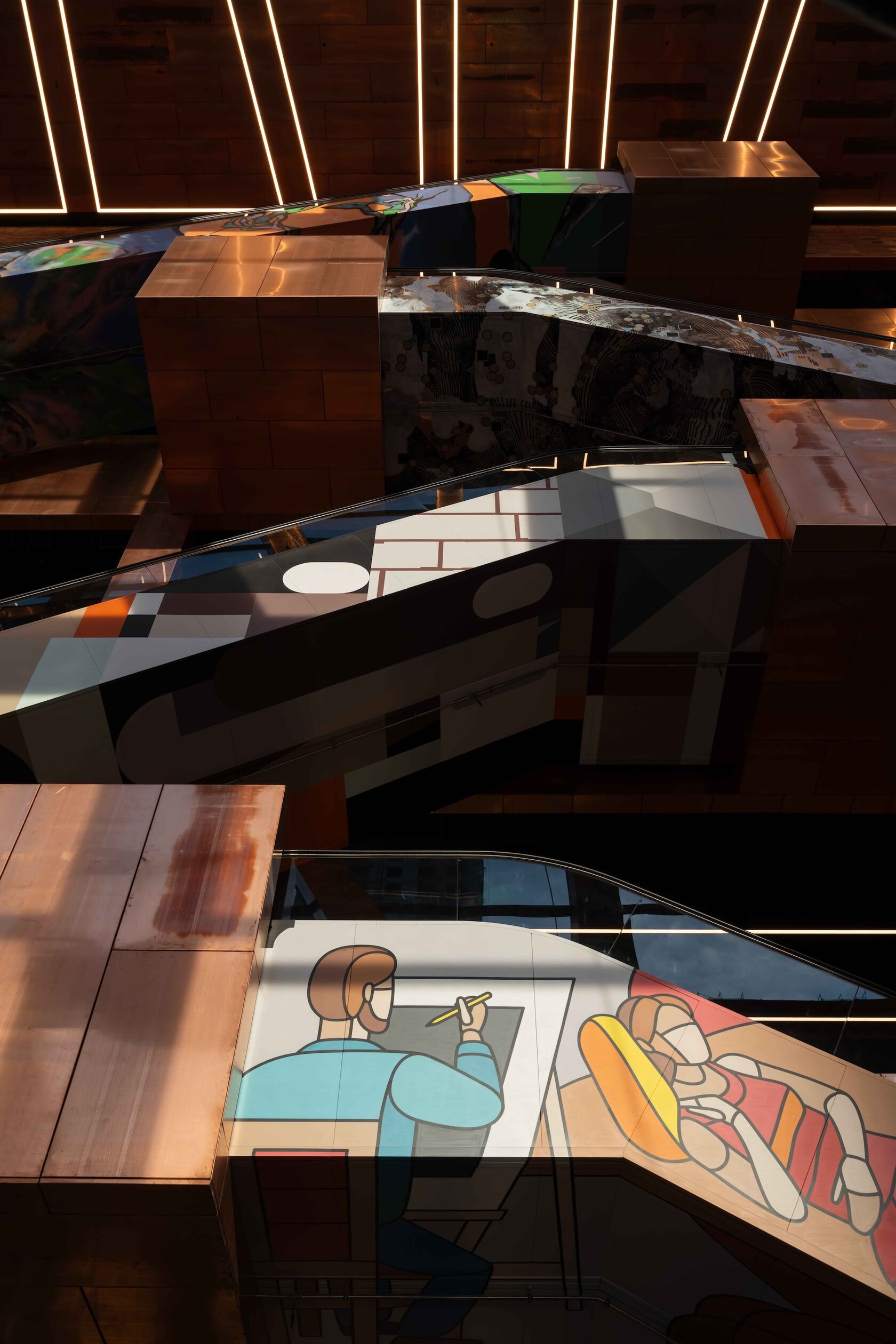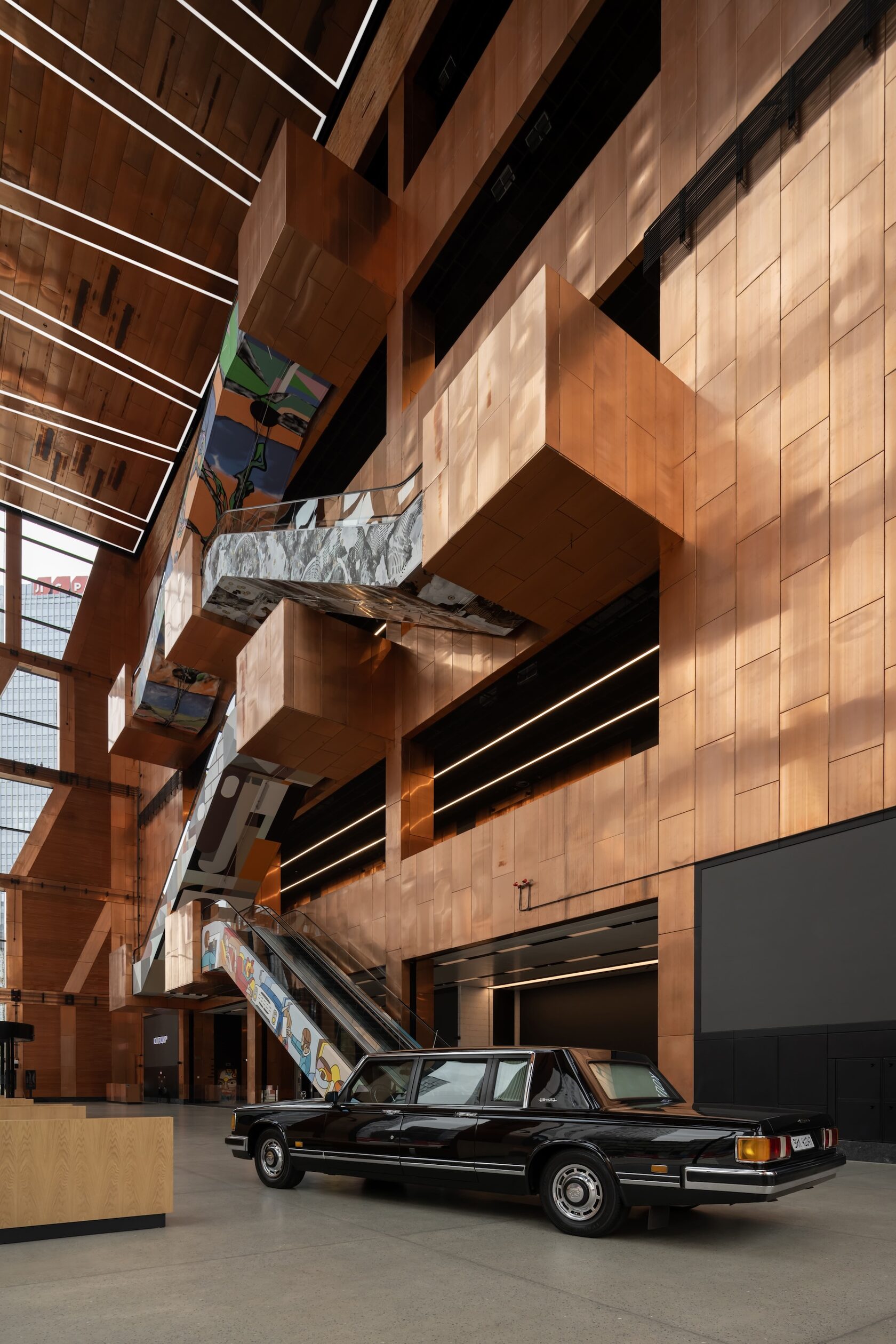 Что касается внутренней архитектуры, то здесь еще стоит упомянуть, что эскалаторы и лифты расписаны четырьмя художниками, вышедшими из стрит-арта. Графика Андрея Бергера, похожая на увеличенные отпечатки пальцев, превращает движение наверх в медитацию о памяти материала — меди, бетона, кожи города. Работы Дмитрия Аске, Алексея Луки и Максима Има преобразуют эскалаторные пролеты в небольшие персональные выставки, предваряющие вход в залы музея.